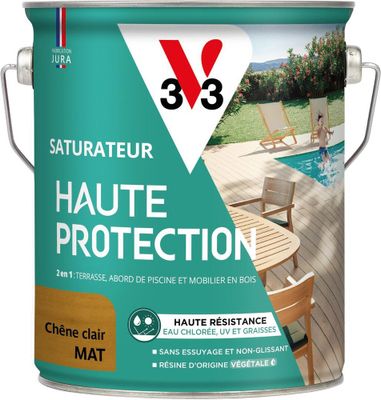 Le SATURATEUR HAUTE PROTECTION V33 s'applique sur toutes les terrasses, decking, caillebotis et mobilier en bois (chaise, table, banc, jardinière...) et sur tous types de bois : européens, exotiques, bois composites et bois traités en autoclave.