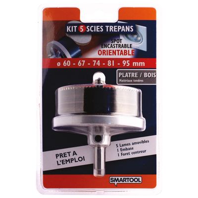 Cette scie cloche multilames SMARTOOL vous permettant de poser un spot encastrable orientable dans un faux plafond vous permet effectuer des perçages dans des matériaux tendres comme le bois, le plastique ou le plâtre.
