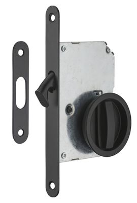 Serrure à crochet axe 50 mm rosaces rondes noires pour porte coulissante THIRARD