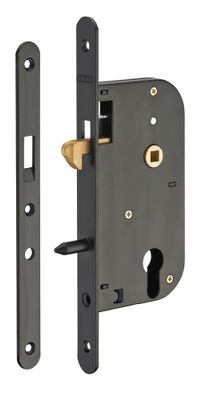 Cette serrure à encastrer à mentonnet convient pour une porte coulissante.