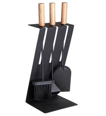 L'ensemble se compose d'un balai, d'une pelle et d'un tisonnier, ainsi que d'un support sur lequel les outils peuvent être accrochés après utilisation.
