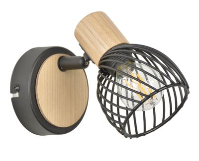 Le spot E14 Kento noir et bois 25W de COREP combine design industriel et chaleur naturelle grâce à son abat-jour en métal grillagé noir et sa finition effet bois.