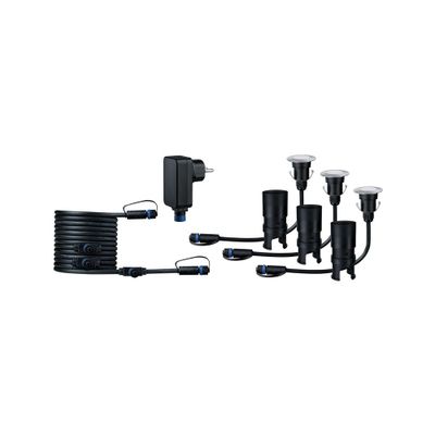 Ce kit prêt à l'emploi Floor de la gamme Plug & Shine de Paulmann comprend 3 spots encastrés Floor, un câble de raccordement et un transformateur de 21 watts.