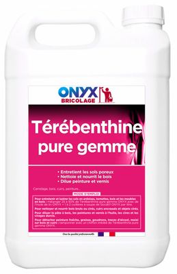 La térébenthine pure gemme ONYX convient pour nettoyer et nourrir les bois bruts ou cirés, les cuirs encrassés ou les objets cirés.