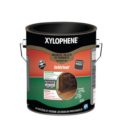 Ce traitement liquide XYLOPHENE spécial meubles et boiseries vous permettra de traiter et protéger tous vos meubles, objets ou parquets intérieurs en bois neufs ou anciens contre les insectes nuisibles (termites, capricornes)