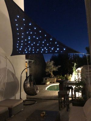Munie de 75 LEDS solaires, cette solution d'ombrage vous protégera du soleil en journée et recréera un effet ciel étoilé dès la nuit tombée.